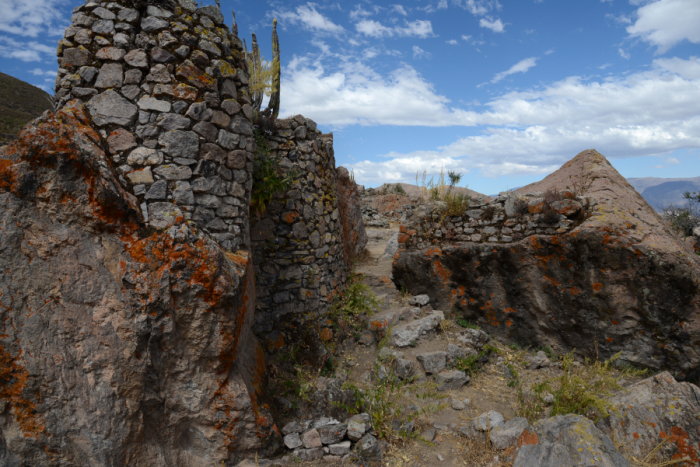 Der Komplex enthält sehr viele Ruinen von einst runden (sic!) Häusern, die allesamt mit Gestrüpp überwuchert sind. Sie finden sich ausschließlich auf der westlichen Seite. Am östlichen Abhang dagegen ziehen sich endlos Terrassenfelder hin. Ohne technische Hilfsmittel lässt sich nicht ermitteln, ob es 50 oder 80 Gebäude oder sogar mehr waren. Die Anlage besteht aus mehreren Sektoren. Vermutlich Wachhäuser standen direkt am Pfad, eher am Hang finden sich dann Wohngebäude und Speicher. Oben wurde der Berg zu zwei Plattformen („Kreisen“?) begradigt, so dass möglicherweise heilige Rituale auf diesen Plätzen abgehalten wurden. Auf der obersten Plattform reckt sich schließlich ein Inti Watana gen Himmel, ein Stein, an den die Inkas die Sonne anbinden konnten. Er ist zu den heiligen Apus, den Berggottheiten, der Region ausgerichtet. Gegenüber, auf der anderen Seite des Cañón de Marán, ist es der weibliche Schutzgeist des schneebedeckten Vulkans Sara Sara. Im Rücken wacht hingegen der männliche Apu des Llomachocca über den Komplex.
