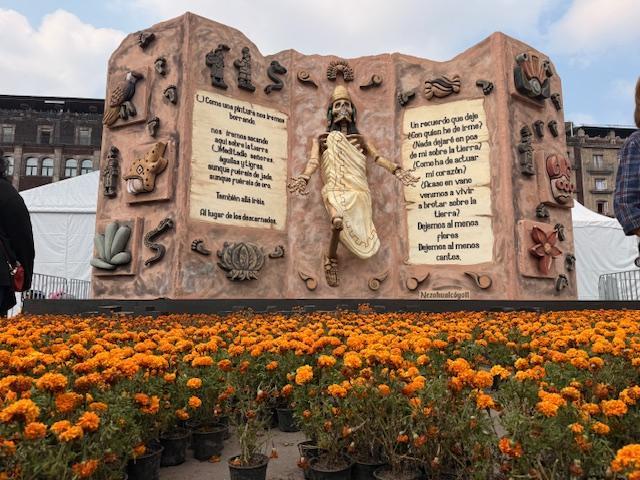 In diesem Jahr wurde das historische Zentrum von Mexiko-Stadt rund um den Día de Muertos mit einem monumentalen Altar geschmückt.Früher wurde dieses Fest eher im kleinen Kreis gefeiert. In jedem Haus gab es eine kleine Ecke, die den Familienaltären gewidmet war. Auch in den Schulen, selbst in den katholischen, wurden Altäre für wichtige historische Persönlichkeiten aufgestellt. Vielleicht wurden zum Spaß die berühmten „Calaveritas“ geschrieben – kurze Gedichte, die meist Freunden und Familienmitgliedern gewidmet sind und eine absurde Situation schildern, in der der Tod sie besucht. Manchmal als Sieger, manchmal als Verlierer, aber immer voller Humor. Wer konnte, besuchte