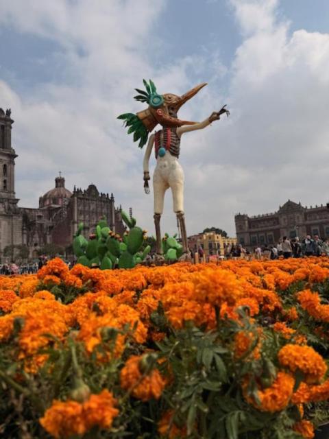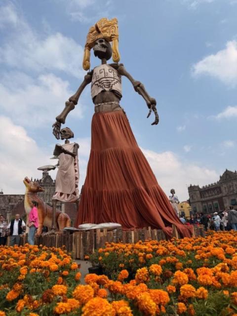 Besucher aus aller Welt das Land in der Erwartung, ein solches Spektakel zu erleben. Mexiko, als großzügiger Gastgeber, wollte nicht enttäuschen und machte sich an die Arbeit. Aus dem stillen Ritual, den größten und schönsten Altar zu schaffen, ist nun – auch wenn es nicht verdrängt wurde – ein endloser Reigen von tanzenden und schielenden Skeletten geworden, die für ein paar Tage die Straßen des Zentrums bevölkern.Doch zurück zum monumentalen Altar: Er ist nicht traditionell, da ihm die typische pyramidenförmige Struktur fehlt. Angeblich befand sich der Platz, auf dem er errichtet wurde, gegenüber dem, was einst der Templo Mayor des alten Tenochtitlán war. Riesige Pappmaché-Skulpturen in Form von Skeletten, dargestellt als Krieger, Gottheiten und aztekische Bauern, begleitet von zwei riesigen und treuen Xoloitzcuintles, umgeben von Millionen von Cempasúchil-