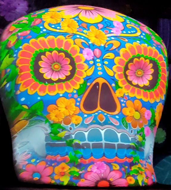 Abschließend soll hier noch der Leipziger Beitrag zur Ausstellung gewürdigt werden: eine Projektion zum Día de los muertos. dem Tag der Toten. Warum diese mexikanische Tradition in diesem Zusammenhang gewählt wurde, erschließt sich nicht so richtig. Frida Kahlo hatte Votivbilder gesammelt, keine Skelette aus Pappmaché. Aber da inzwischen alle „Coco“ gesehen haben dürften, ist die Wahl dieses Festes naheliegend, da es allgemein als ganz typisch mexikanisch angesehen wird. Und so gibt es passenderweise den Día in der Hollywood Version – grellbunt, mit viel Musik und tanzenden Calaveras. Mittelpunkt dieser Experiencia ist ein drei Meter hoher Totenschädel aus dem 3D-Drucker. Das ist beeindruckend gut gemacht. Und auch, wenn diese Projektion nicht ganz zu einer „Frida Kahlo Experience“ zu passen scheint, unterhaltsam ist sie allemal.